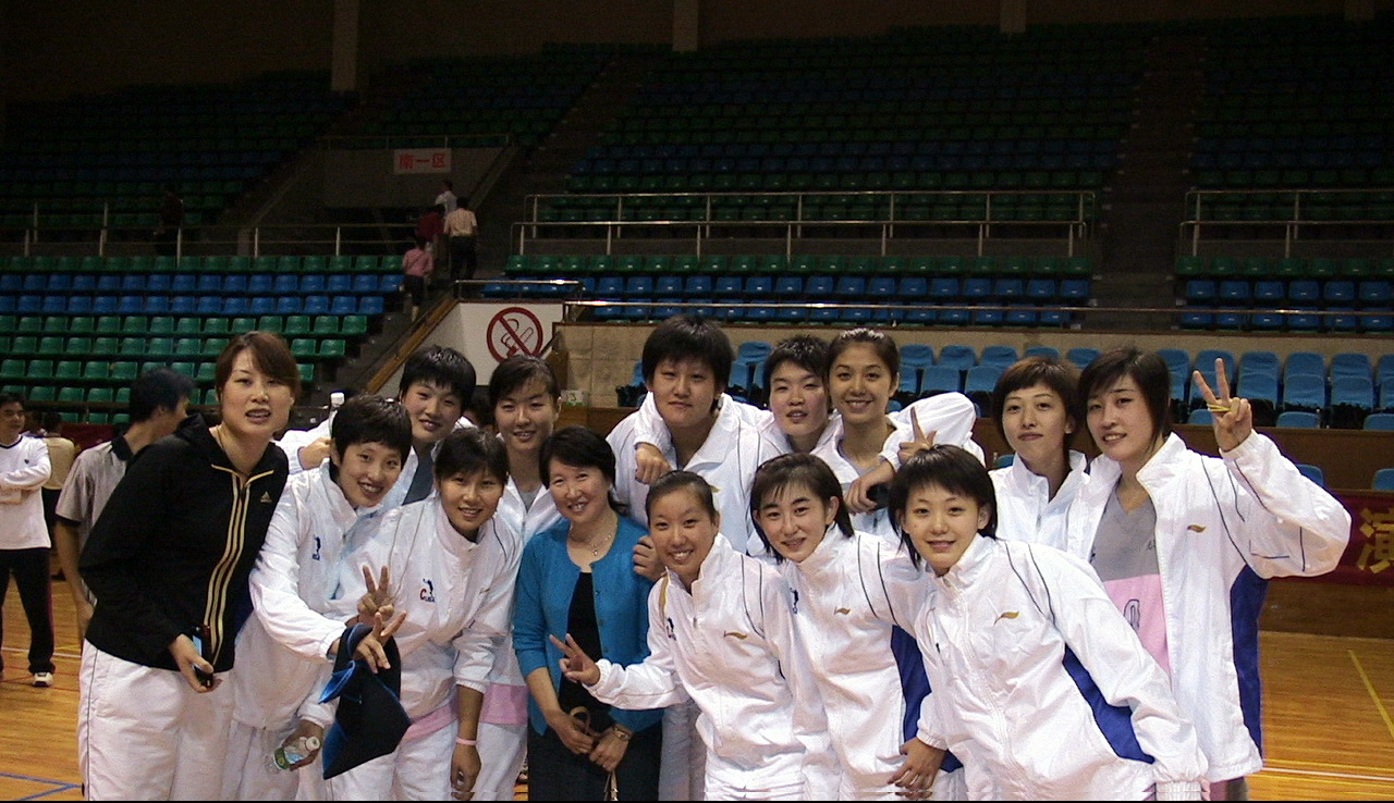 图为2006年9月,在广东省阳江市参加慈善募捐义演篮球赛(居中者为威廉体育williamhill办公室主任徐勤霞)